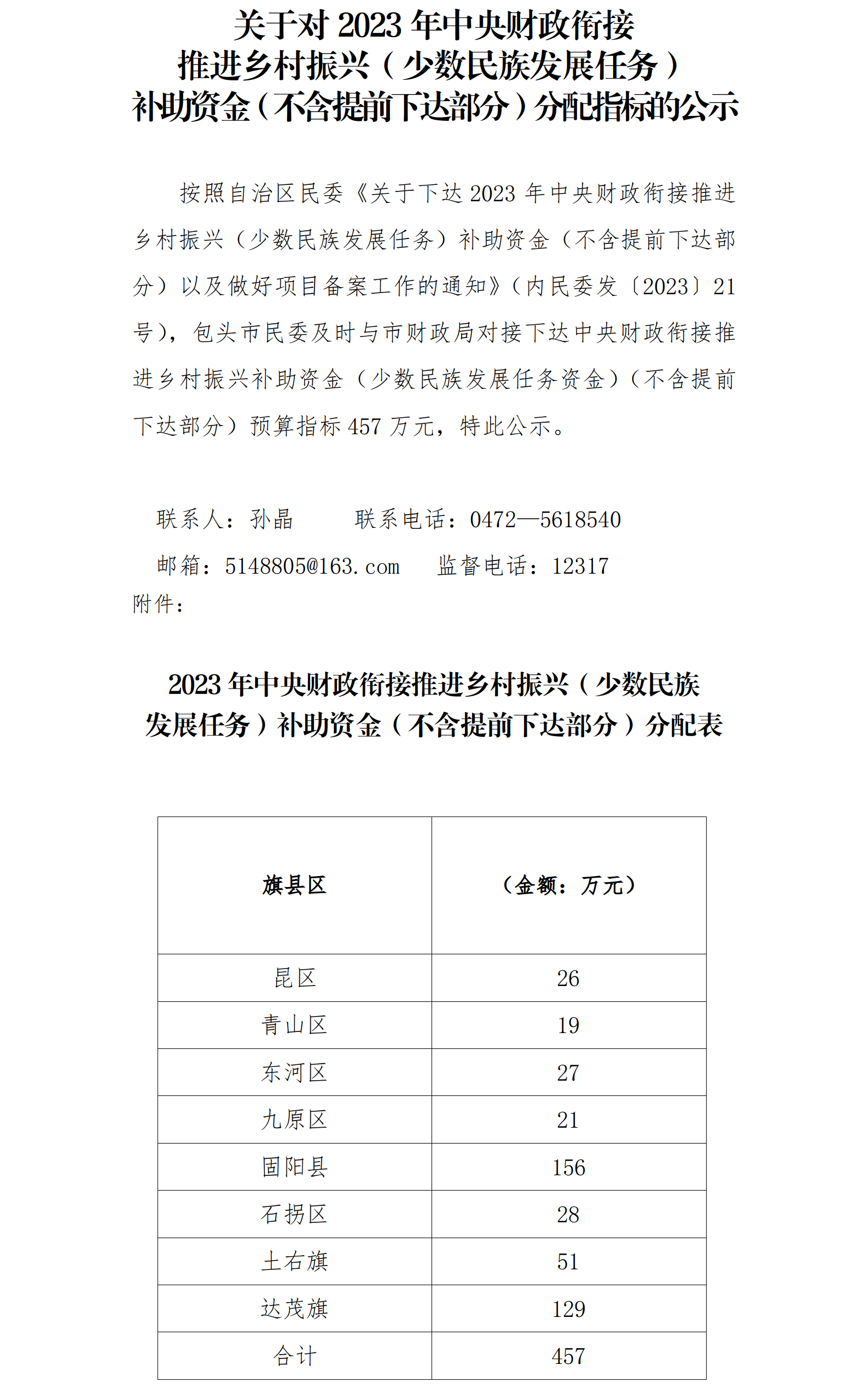 关于对2023年中央财政衔接 推进乡村振兴(少数民族发展任务) 补助资金(不含提前下达部分)分配指标的公示