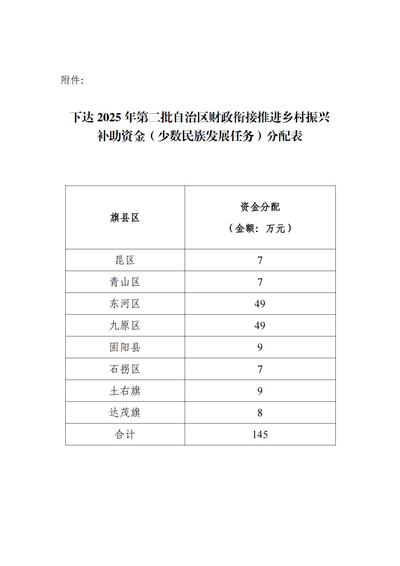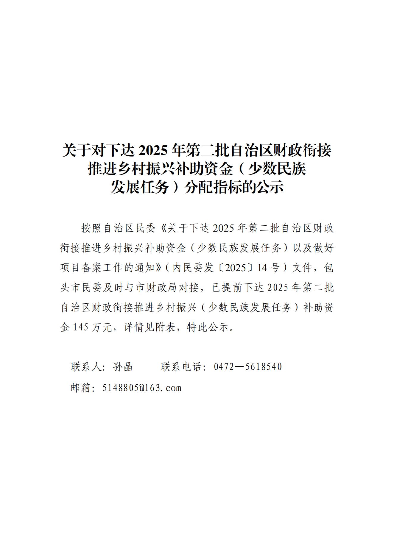 关于对下达 2025 年第二批自治区财政衔接 推进乡村振兴补助资金(少数民族 发展任务)分配指标的公示